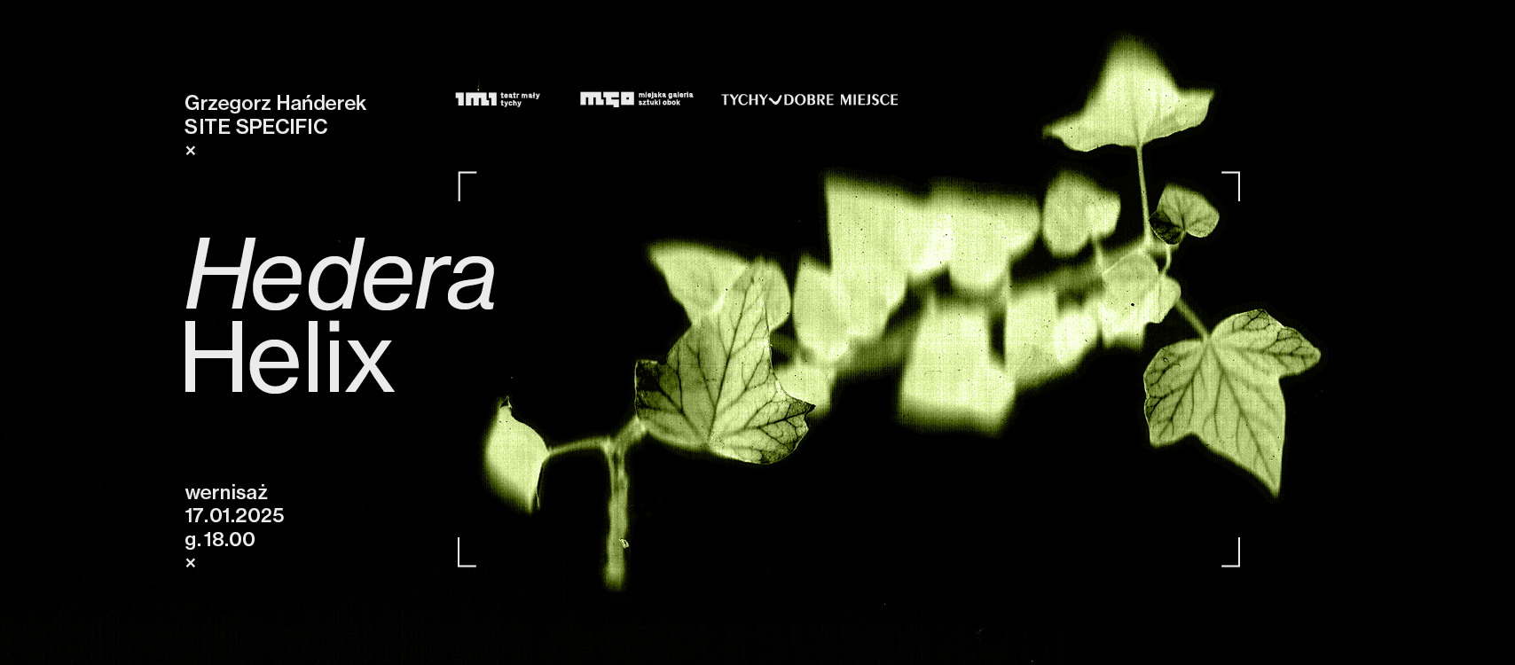 Na koniec obchodów trzydziestolecia Miejskiej Galerii Sztuki Obok Grzegorz Hańderek, artysta i rektor katowickiej Akademii Sztuk Pięknych, kiedyś mieszkaniec Tychów, pokazał w galerii instalację o zagadkowym, obco brzmiącym tytule. Na plakacie do wystawy „Hedera Helix” zauważamy niewielki fragment łodygi bluszczu z listkami, wyraźnymi i rozjaśnionymi w świetle, być może, noktowizora. Wchodzimy na salę wystawienniczą i możemy się zdziwić. Widzimy zupełnie inną kolorystykę, biel ścian, ciemny brąz podłogi i srebrne smugi na podłodze. Okazuje się, że wykorzystane do stworzenia instalacji tworzywo nie jest botaniczne, jak sugerowałby plakat, a techniczne. Dostrzegamy splątane kawałki stalowego drutu, pociętego na nierównej długości odcinki, z drutu wyraźnie wystają ostre prostokąciki.