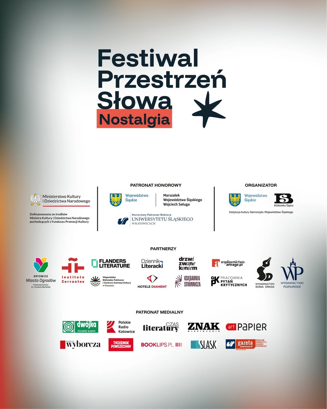 Podczas 5. edycji interdyscyplinarnego Festiwalu Przestrzeń Słowa wystąpią m.in.: laureat Literackiej Nagrody Nobla – Abdulrazak Gurnah (Anglia), autor bestsellerowej „Nocy szpilek” – Santiago Roncagliolo (Peru), czy też nominowany do Nagrody Bookera, twórca arcydzielnej „Wojny i terpentyny” – Stefan Hertmans (Belgia). O demagogii współczesnego świata opowie wybitny włoski pisarz Antonio Scurati. Nie zabraknie wielkich postaci świata poezji. Do Katowic przyjadą m.in. zdobywca tegorocznej Nagrody T.S. Eliota Peter Gizzi (USA) czy też znakomita poetka i performerka Juana Adcock (Meksyk), która spotka na scenie polską autorkę Julię Fiedorczuk. Nie zabraknie także uznanych polskich twórców. O nostalgii porozmawiają, nominowana do Nagrody Bookera, Urszula Honek oraz Grzegorz Jankowicz. Samotność i nostalgię wielkich miast wirtuozersko uchwycą Filip Łobodziński, Justyna Sobolewska, Michał Choiński, Pola Dwurnik i Zofia Król. Podczas spotkania z trójką wybitnych poetów Andrzejem Sosnowskim, Jerzym Jarniewiczem oraz Marcinem Sendeckim nostalgia napotka ironię, która jest nieodłącznym towarzyszem wybitnej literatury.