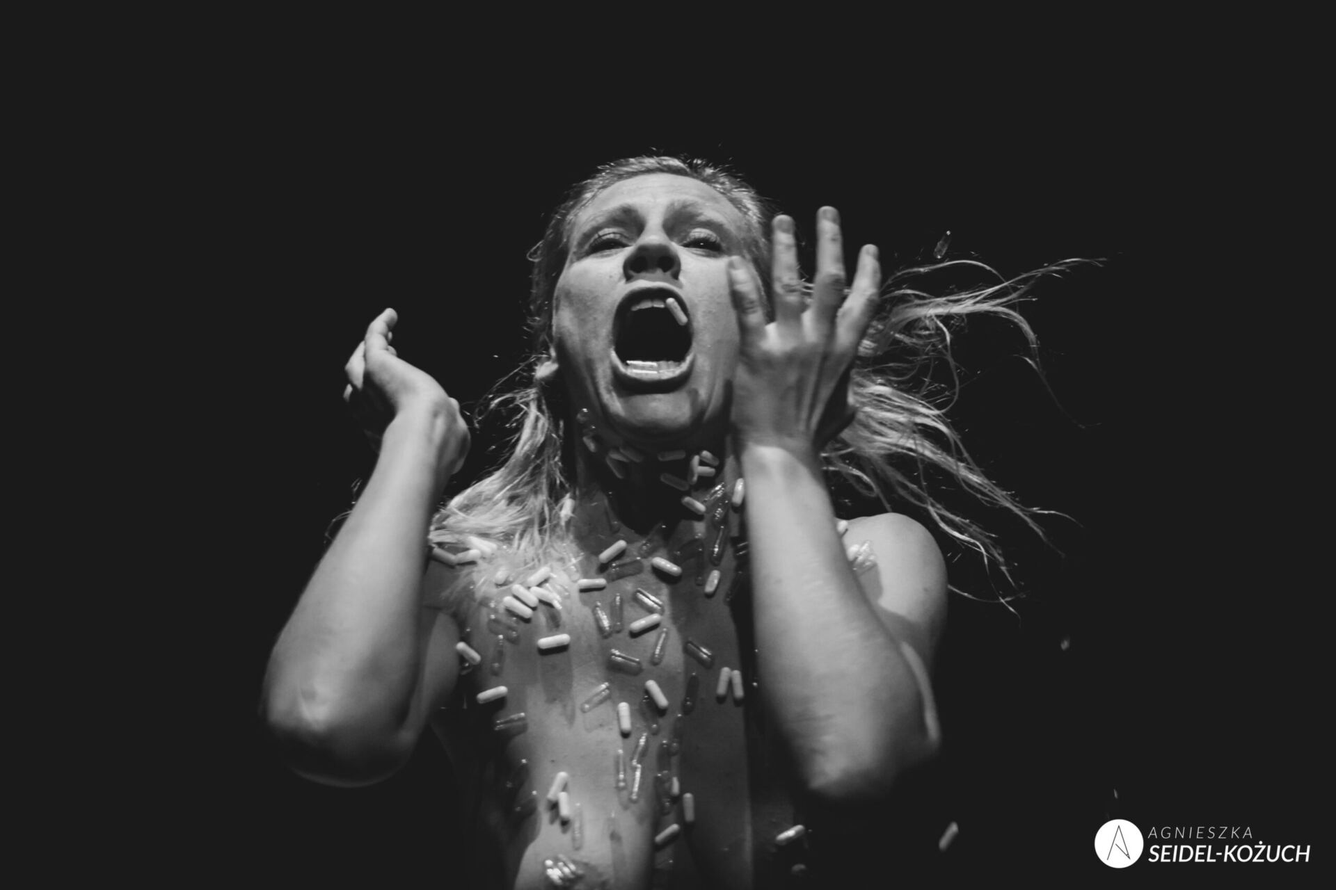 Ten ostatni wątek łączy monodram z wieloma innymi narracjami kobiet chorych onkologicznie, dla których utrata włosów, mastektomia i histerektomia nie były tylko medycznymi zabiegami, ale fundowały traumę właściwie tożsamościową. Stawiały bowiem przed pytaniem, jak definiować w nowych warunkach własną kobiecość. Nie sposób uciec przed tym wątkiem również w trakcie monodramu, bo za sprawą gry Moniki Wachowicz ciągle mamy przed oczami cielesność. Bezwzględnie jest to według mnie atut spektaklu, bo praca ciałem w większym stopniu niż dyskurs (uciekający czasem w patetyczność), oddaje mięsność choroby nowotworowej. Znaczna część spektaklu koncentruje się na walce na śmierć i życie, której charakter podkreślają sekwencje marszowo-reprezentacyjne. Bohaterka, niosąca na plecach osobliwe „trofeum” z kobiecych włosów i posługująca się stojakiem na kroplówkę jak bronią, maszeruje do rytmu songu Mickey Mouse z wojennego filmu „Full Metal Jacket”. Taka wizualizacja metafory walki dowodzi – wbrew temu czego oczekiwała Susan Sontag – że jest ona wciąż podstawowym sposobem radzenia sobie z chorobą. To jak słuchanie zewu do walki, dochodzącego wręcz z własnych trzewi. Wachowicz nie oszczędza własnego ciała, pokazując, jak ból prowadzi do ekstremalnych konfiguracji. Echem powracają tutaj obrazy kobiecych ciał wygiętych w łuk, słynne mostki łączone z emocjonalnością i histerią. Tym razem jednak są wywołane realnym i przejmującym bólem. Podobnie działa obraz chemioterapii: scena – majstersztyk, z kobietą wynurzającą się z wypełnionej kapsułkami wanny-trumny jak z kokonu. Tak silna ekspozycja cielesności i podkreślenie wagi metafory walki nie prowadzi jednak do uwznioślenia ciała. Patetyczność osłabia bowiem sama rama inscenizacyjna: monodram konfrontuje z samotnością bohaterki, jej alienacją, chorobowym wyobcowaniem, faktem, że ból – nawet przy empatii i współodczuwaniu – czuje tylko ona.