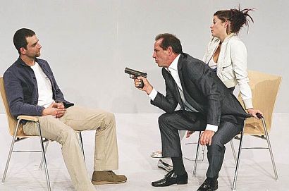Dużo ciekawiej zaprezentowali się aktorzy Teatru Montownia w tragigrotesce Pavla Kohouta „Wojna na trzecim piętrze”. Reżyser Paweł Aigner znakomicie zainscenizował absurdalność sytuacji, nawiązującej momentami do klimatu z Mrożka, Frischa czy Kafki. Stworzył metaforyczną przypowieść o prywatnej wojnie domowej, w której uczestniczą jednostki wyselekcjonowane przez komputer. Doktor prawa Emil Blaha (bardzo dobra rola Rafała Rutkowskiego) musi stoczyć w swoim własnym pokoju, w środku nocy, batalię z niemieckim handlarzem win, Millerem. Ofiary, jak w każdej wojnie, nie ominą żadnej ze stron. Spektakl Montowni jest bardzo precyzyjnie zakomponowany od pierwszej sceny małżeńskiej do finałowej hekatomby. Jest mądry, inteligentny i przerażająco aktualny.