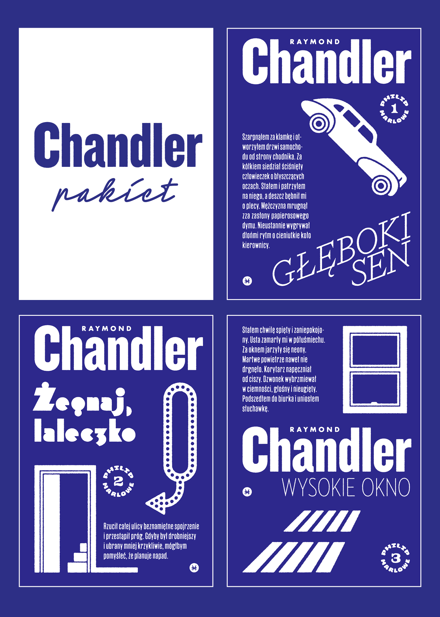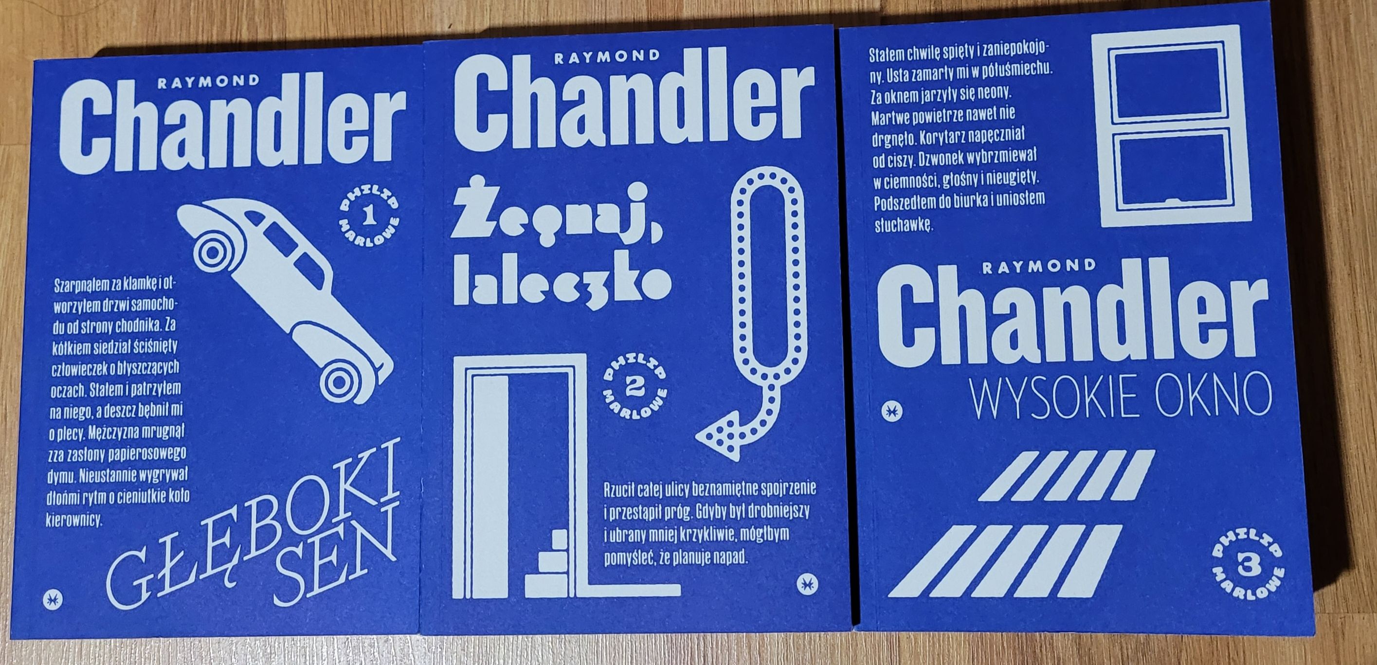 W przeciwieństwie do bohaterów Chandlera nie noszę broni, więc nie porównam ze spluwą – ale jeśli chodzi o książki, to dawno żadne tak dobrze nie leżały mi w dłoniach. Nawet z faktem, że są intensywnie niebieskie, a nie tradycyjnie czarne, oswoiłam się zaskakująco szybko. Za to naprawdę mroczna wiadomość brzmi, że podobno następne tomy będą mi dobrze leżeć w dłoniach najwcześniej w przyszłym roku, więc trzeba być jak potencjalny klient Marlowe’a: „Moje biuro mieściło się na szóstym piętrze Cahuenga Building, zaledwie dwa niewielkie pokoiki na tyłach. Jeden zawsze był otwarty, bo służył za poczekalnię, o ile akurat miałem wystarczająco cierpliwego klienta” (WO, s. 29). Cóż, najwyżej dotychczasowe okładki, przy powtórkach ułatwiających cierpliwym klientom wygadanego detektywa oczekiwanie, wytrą się szybciej, niż zaplanowano.