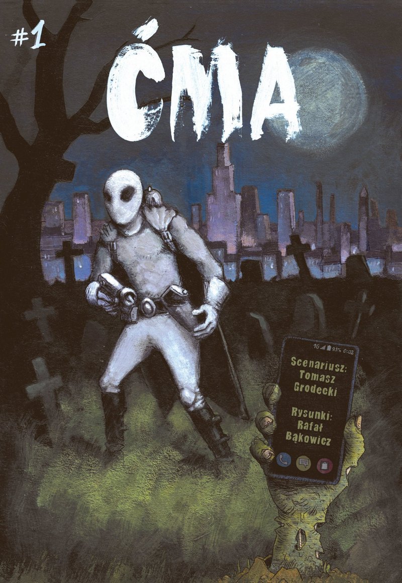To właśnie za sprawą wspomnianego tytułu prasowego dowiadujemy się, że stolica żyje sprawą zaginięcia Cypriana Leopolda Różewicza: szanowanego malarza, poety, lowelasa i geniusza awangardy. Ten sam periodyk donosi także o pojawieniu się zamaskowanego obrońcy uciśnionych zwanego Ćmą. Nietrudno zgadnąć, że poszukiwany artysta i „śmiałek w bieli” to tak naprawdę jedna i ta sama osoba, w dodatku pełniąca obowiązki narratora. Autorefleksyjna opowieść protagonisty zabiera nas wprost na „Stację końcową”, gdzie w rozpędzonym pociągu bohater staje naprzeciw siepaczy Sędziego. Po tym dynamicznym, utrzymanym w czarno-białej tonacji otwarciu – udowadniającym, że Ćmie nieobce jest współczucie – przychodzi czas na „Selfie trumienne” (w warstwie wizualnej urozmaicone o dodanie stalowej dominanty), czyli konfrontację zamaskowanego herosa ze stowarzyszeniem odpowiedzialnym za przemianę ludzi w żywe trupy. A wszystko to za sprawą smartfonów.