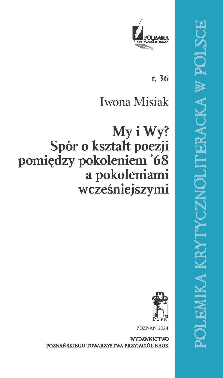 Iwona Misiak: „My i Wy? Spór o kształt poezji pomiędzy pokoleniem ’68 a pokoleniem wcześniejszym”. Wydawnictwo Poznańskiego Towarzystwa Przyjaciół Nauk. Poznań 2024 [seria: Polemika Krytycznoliteracka w Polsce].