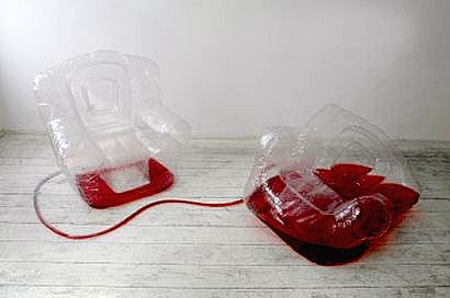 Autorką instalacji „Transfuzja” jest Dorota Buczkowska. Praca ta składa się z dwóch nadmuchiwanych, przeźroczystych foteli, wypełnionych płynem przypominającym krew. Dodatkowo fotele połączone są ze sobą za pomocą rurki. Jeden z nich nie jest do końca wypełniony powietrzem, leży na podłodze. Transfuzja, odczytywana jako symbol niesienia pomocy drugiej osobie, w tym wypadku zatraca aspekt dobrowolnego poddania się temu zabiegowi. Córka niejako nie ma wyboru, oddaje swoją życiową energię matce. Jest to rodzaj psychicznego uzależnienia. Nasuwa się także skojarzenie z pępowiną, która – jeżeli odniesiemy się do utworu – nigdy nie została odcięta.