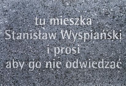 Artyści biorący udział projekcie odnieśli się w swoich pracach do osoby Wyspiańskiego, do jego życia oraz dorobku twórczego, temat ubierając w formę wypowiedzi artystycznej charakterystycznej dla ich warsztatu. Wystawę otwierają dwie prace, powiększona sygnatura Wyspiańskiego wycięta w metalu (Aleksander Janicki) oraz kamienna tablica z napisem „Tu mieszka Stanisław Wyspiański i prosi aby go nie odwiedzać” (Karolina Kowalska). Karteczka o takiej treści znajdowała się na drzwiach mieszkania artysty w ostatnim roku jego życia. Słowa wyryte na tablicy można rozumieć dosłownie, w odniesieniu do biografii Wyspiańskiego i jego izolacji społecznej, która miała bezpośredni związek z chorobą. Kamienna płyta może stanowić także pretekst do dyskusji na temat stosunku Wyspiańskiego do mieszczaństwa. Z jednej strony znana jest krytyczna postawa artysty wobec tej warstwy społecznej, przedstawiona choćby w „Weselu”, z drugiej Wyspiański wykonał wiele projektów, które można określić mianem sztuki publicznej, a które sponsorowane były właśnie przez mieszczaństwo. Jest to także gra z widzem, zamiast zaproszenia do zwiedzania, oglądający zostaje posądzony o bycie intruzem oraz poproszony o nienaruszanie prywatnej przestrzeni artysty.