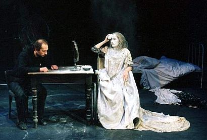 Hajewska-Krzysztofik i Hudziak rysują swoje role z pozoru grubą, karykaturalną kreską, mocno osadzając je w cielesności. Ona wydaje się zgorzkniałą, marudną, skupioną na materialnym wymiarze życia kaleką. Łamiącym głosem domaga się od Konrada spełniania kolejnych zachcianek, nieustannie przebiera suknie, dręczy go wyrzutami i żądaniami niemożliwymi do spełnienia. On, słaby, neurotyczny, rozedrgany, przypomina klasyczny przykład egoistycznego nieudacznika-improduktywa o wybujałych ambicjach. Śmieszą ich zmiany nastrojów, kłótnie, złośliwości, dziecinne kaprysy Konradowej, bezsilne miotanie się Konrada, i publiczność śmieje się, szczerze i głośno, trochę tylko jakby zawstydzona. Pod prawdą tych „scen z życia małżeńskiego”, ukazanych z bezlitosną skrupulatnością przyrodnika, kryje się jednak prawda całkiem innego gatunku. W ostatniej części spektaklu, na chwilę przed niepokazanym przez reżysera zabójstwem, boleśnie banalna, ponura codzienność bohaterów zyskuje wymiar rytuału, w którym małżonkowie reprezentują przeciwstawne siły: ducha i materii, sztuki i życia. Konrad Hudziaka jest mistykiem, człowiekiem, któremu odsłoniła się niezapisywalna tajemnica życia; Konradowa Hajewskiej dąży do wyzwolenia poprzez śmierć, wolna od strachu przed przemijaniem, bólem, nicością.