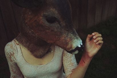 Zatrzymajmy się przy tym motywie, zwracając uwagę na fotografię zatytułowaną „Rana”. Widzimy na niej postać, która przywołuje skojarzenia z zoomorfizmem. Zjawisko to polega na przedstawianiu bóstw w zwierzęcym kształcie. I tak starożytni Egipcjanie przedstawiali swoich bogów jako pół ludzi, pół zwierzęta, czego przykładem jest postać Anubisa o ciele człowieka i głowie szakala. Tego typu zoomorfizm jest obecny w twórczości Laury. Wydaje się, że autorka nie mówi tu o konkretnym zwierzęciu, o konkretnym człowieku, ale stwarza nowy zaskakujący odbiorców byt (bóstwo). „Rana”, przedstawiająca postać kobiety z głową sarny, zawiera symboliczny ładunek, o którym już wspominałam. Zawartość ekspresyjna (przez co rozumiem połączone oddziaływanie tematu obrazu i jego formy wizualnej) każe zatrzymać wzrok na tym kadrze i „słuchać”. Celowo używam tu słowa słuchać, a nie patrzeć, jestem bowiem głęboko przekonana, że prace te przemawiają swoim szepcącym głosem, jak podkreśla Makabresku: „Dobrze jest szeptać – «wszystko należy robić cicho i powoli», jak pisze Marcin Świetlicki”. Organizacja przestrzenna tego kadru ustawia widza na pozycji dominującej – patrzymy z góry na nieśmiały gest istoty, która podnosi prawą rękę. Widzimy ranę, krew i w tym miejscu rozpętuje się kolejna burza symboli: krew jest symbolem tabu, wtajemniczenia, męczeństwa, odkupienia, jest siedliskiem życia i duszy. Nie wiemy, jak i dlaczego została zadana rana, a może to niezmywalna plama, znamię krwi, które jest symbolem nieodkupionej zbrodni? Pytań jest w tej twórczości wiele, ale są to pytania potrzebne i ważne, takie, które skłaniają do refleksji nad sobą, nad człowieczeństwem w ogóle. Więc nie bójmy się interpretować i pytać.