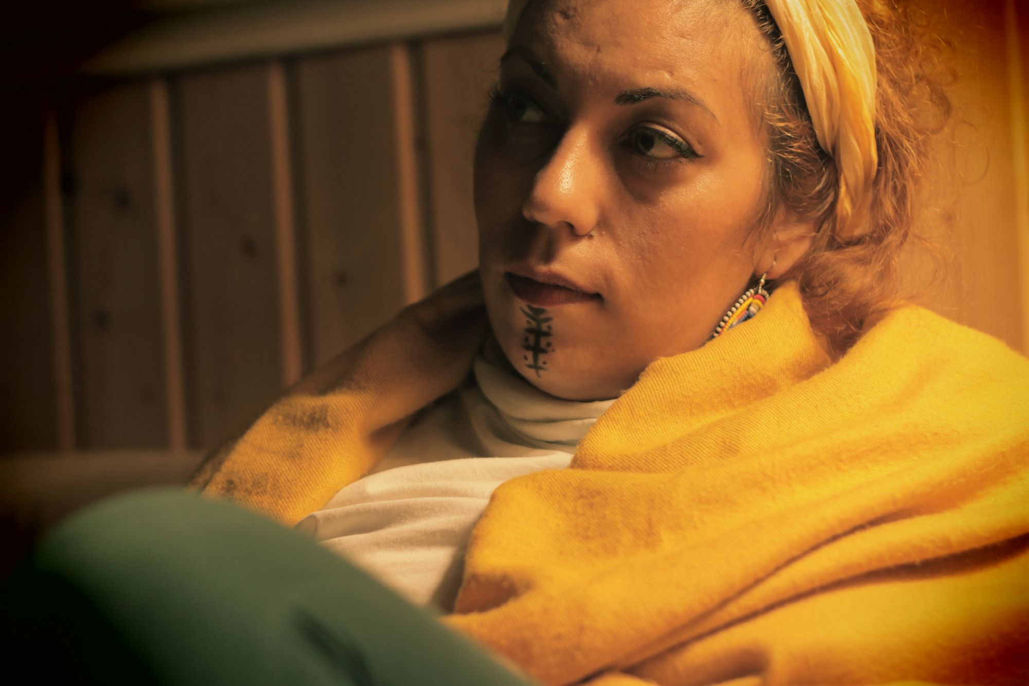 F.K.: Na szczęście masz jednak nową chustę z Polski – kolorową, nie szarą, i wcale przyjemną.