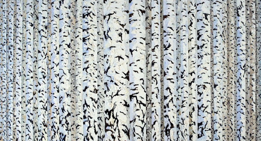 Obrazy Knorowskiego z lat 2017 – 2023 są swoistym studium pni; brzozy przedstawiane są w skupiskach na wielkich płótnach (np. 200 x 130) lub pojedynczo na wąskich pasmach płótna (30 cm), co pozwoliło na rozmieszczenie obrazów w różnych miejscach sal. Na Stalowej takie wąskie obrazy zawisły na wewnętrznych filarach. Dodam, że biel pojawia się na jeszcze jednym, tym razem zimowym obrazie „Białe sosenki”; drzewka wyłaniają się ze śniegu (jakby na łąkach przy ulicy Słonecznej w nadwiślańskim Kazimierzu).
