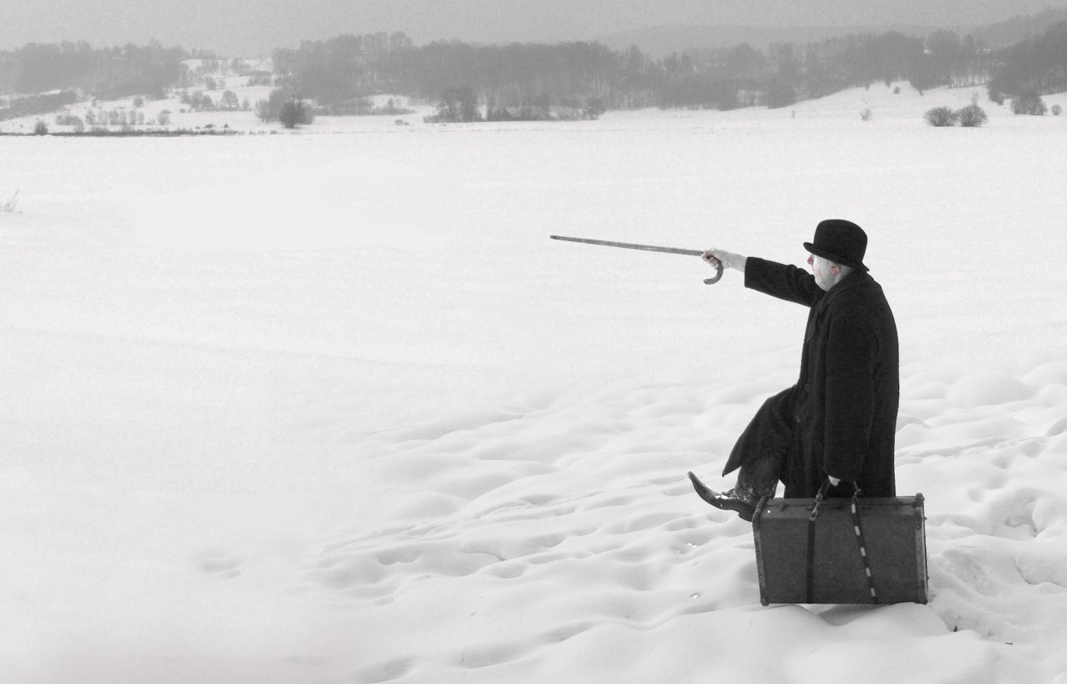 Na ścianach znajdują się trzy wielkoformatowe fotografie. Na pierwszej fotografii Andrzej Wełmiński jako wędrowiec w wizytowych butach, o nienaturalnie wydłużonych, wąskich nosach, z walizką i laską, którą wskazuje kierunek, zamierza przejść przez zasypaną śniegiem łąkę do widocznych w oddali budynków. Fotografia przedstawia wiejski pejzaż, z niewysokimi wzgórzami na horyzoncie. Na drugiej fotografii mężczyzna tkwi na drabinie, opartej o wysoki świerk w plenerze, jakby chciał coś zawiesić na drzewie. Bohater został sfotografowany podczas wędrówki w poziomie (podmiot w pejzażu) i pionie (drzewo jako oś świata).