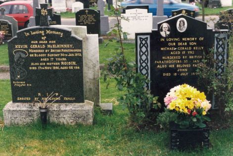 Derry 1995, cmentarz katolicki, na nagrobkach napisy: "Drogiej pamięci naszego drogiego syna Kevina Geralda McElhinney, zamordowanego przez brytyjskich komandosów w Krwawą Niedzielę 30 stycznia 1972, w wieku lat siedemnastu, oraz jego matki Roisin, która umarła 17 listopada 1991 w wieku lat 66 (Swięty Geraldzie, módl się za niego)"; "Drogiej pamięci naszego drogiego syna Michaela Geralda Kelly, który w wieku lat siedemnastu zamordowany został przez brytyjskich komandosów 30 stycznia 1972 roku, oraz jego ukochanego ojca Johna, który umarł 15 sierpnia 199x"